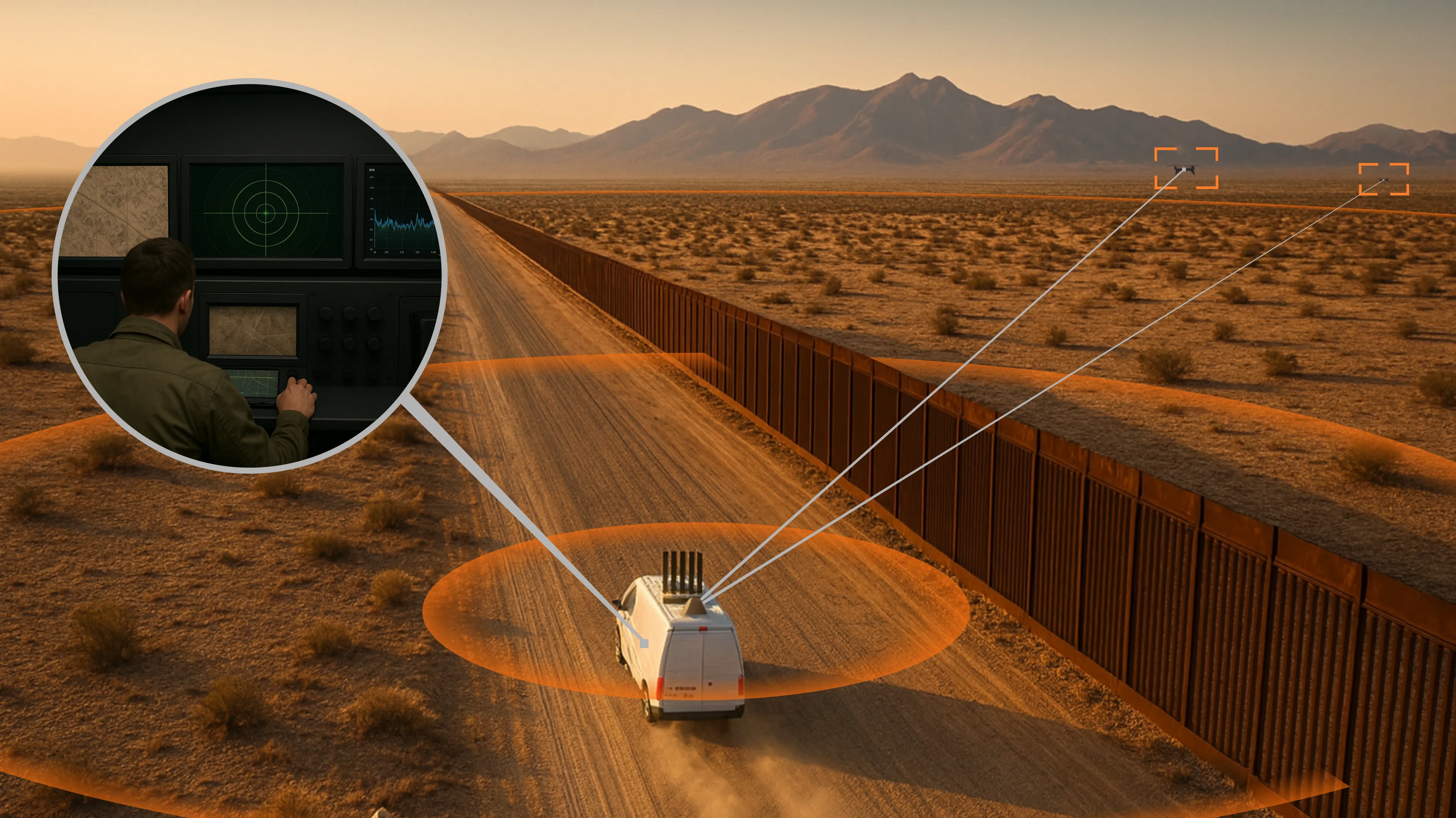 A dusty road along the fence, a patrol van raising a light trail of sand, and a quiet desert sky. Nothing looks unusual from the outside. Inside the vehicle, though, an operator is watching a radar screen. Two small echoes appear on the edge of the display. Drones. The system reacts in seconds, and the threat never reaches the border.